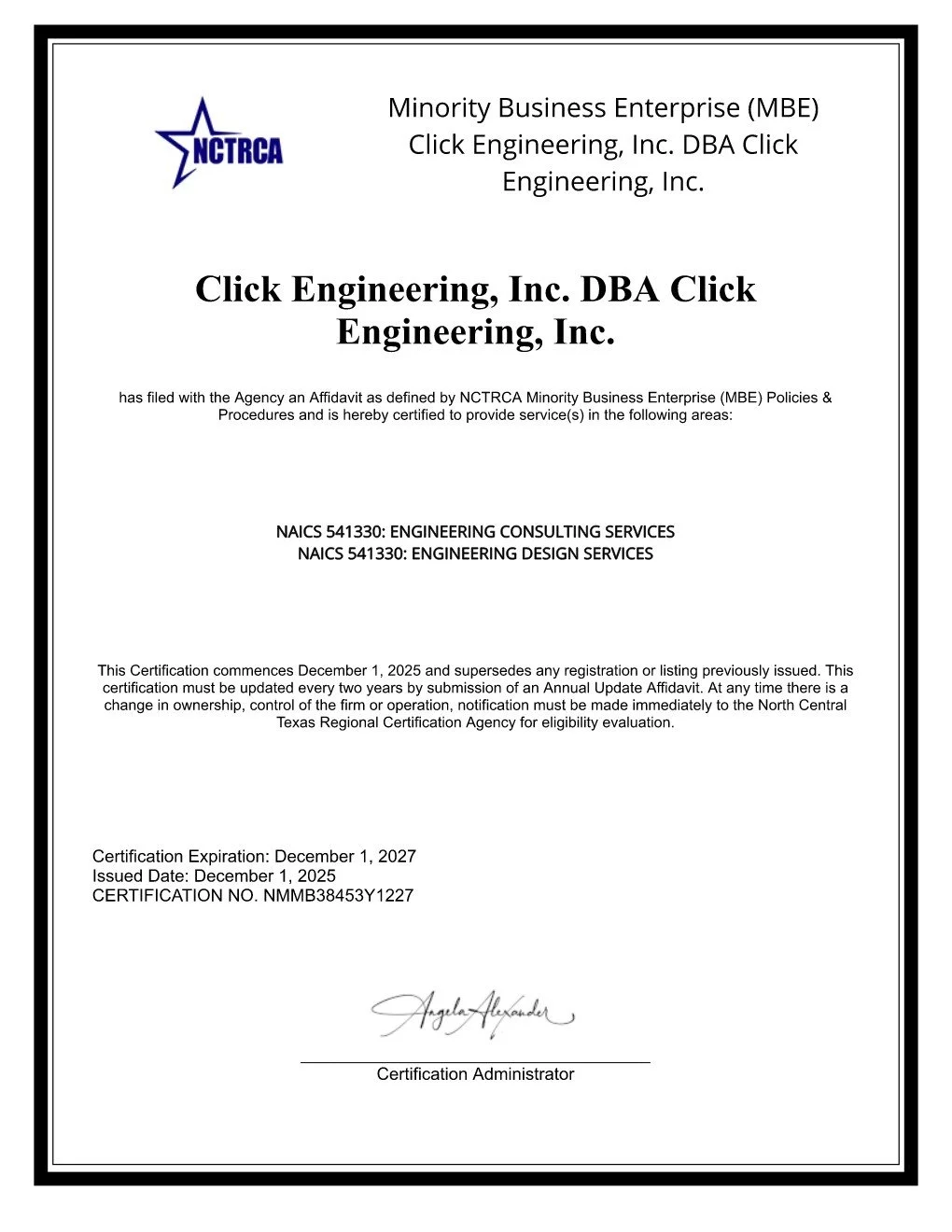 Click Engineering maintains active MBE and SBE certifications and has historically held additional certifications, including HUB.